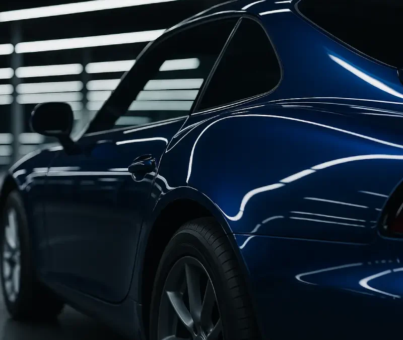 Close-up of a glossy blue coupe under strip lighting, emphasizing smooth surface lines and reflective paint quality on the rear side and door area.