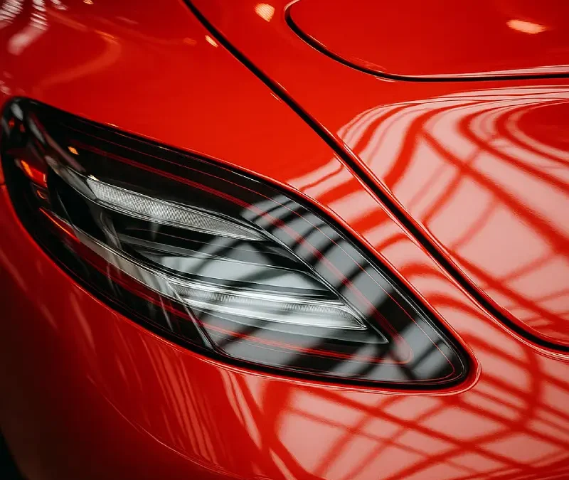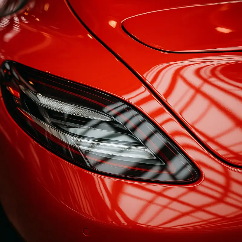 Close-up of a freshly refinished red car panel with seamless paintwork and taillight detailing, showcasing premium surface restoration and reflective clarity.